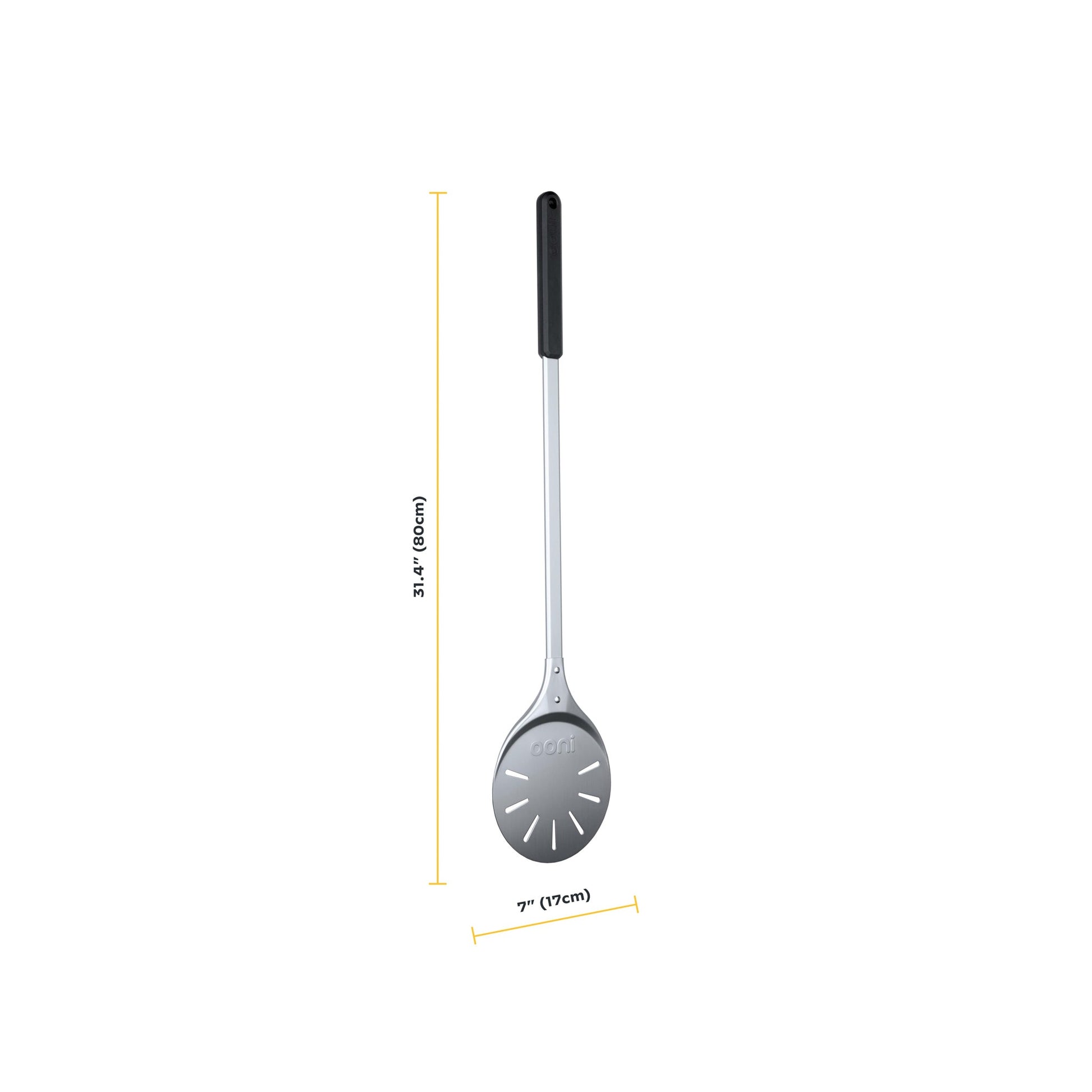 Cook your pizzas faster with the Ooni Pizza Turning Peel, keeping pizzas in contact with the stone baking board as you spin them like a pro in your flaming-hot Ooni pizza oven. The seven-inch, durable anodised aluminium surface has a non-stick effect for sliding right under pizzas, while the perforations let excess flour fall away for a perfectly cooked pizza base.Â